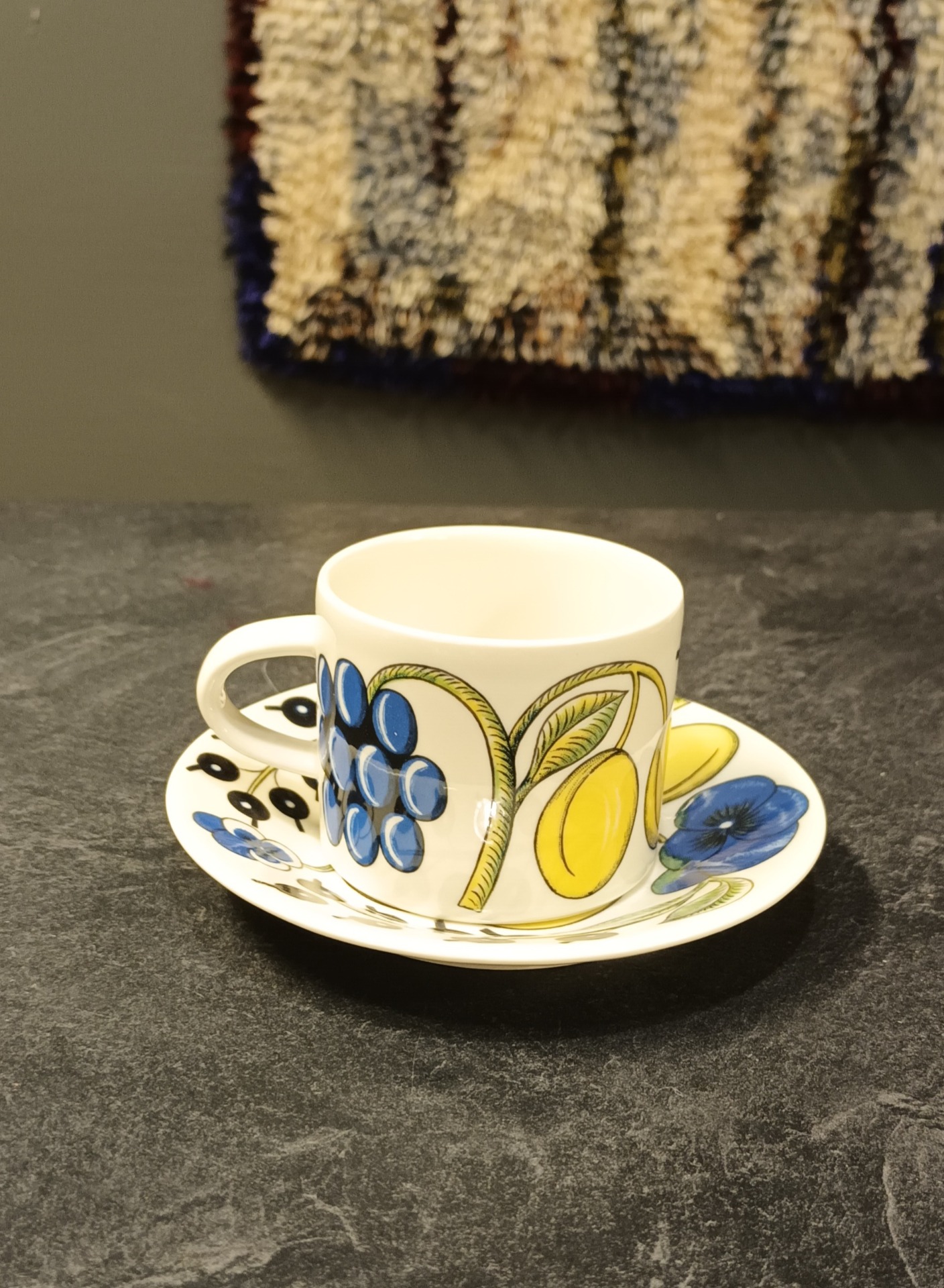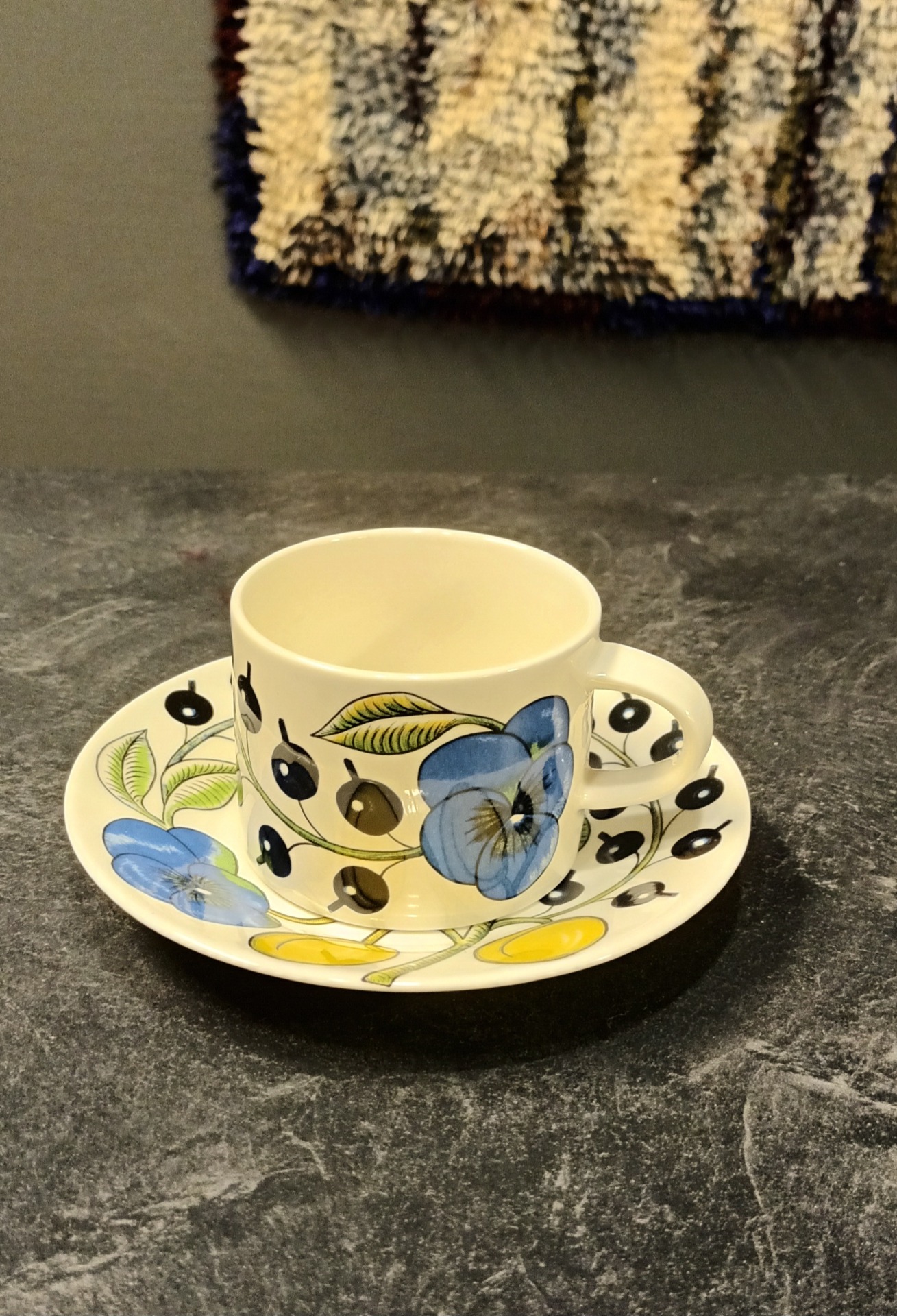 Arabia Valensia teekuppi+tassi, Design Ulla Procope, käsinmaalattu. Hyväkuntoisia. Saatavilla 8kpl 48€/kpl ALE NYT 38€/kpl Kuvan pullalautaset loppuunmyyty.